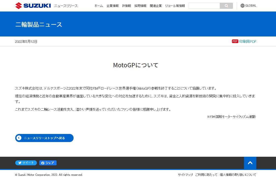 SUZUKI 發出正式新聞稿表示正在與Dorna Sports討論2022年底結束參加MotoGP的事宜。