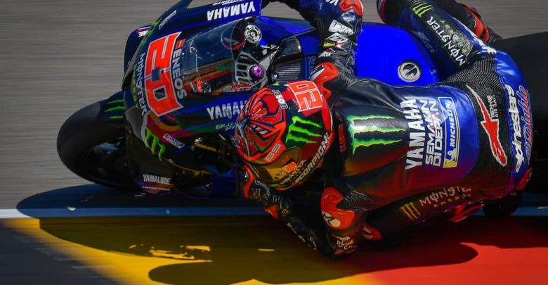 德國站首天練習最終由KTM車手Miguel Oliveira跑出最快單圈時間,德國王本田車手Marc Marquez雖然在早上第一節練習中跑出最快時間,不過最後僅排在第12位結束第一天的練習。 而週五練習最穩健的車手就是Fabio Quartararo,兩節練習都跑出第二快的時間。Marc雖然目前狀況不佳但依舊是潛在的對手,Fabio在練習後接受媒體的訪問時就開玩笑的說想讓Marc在德國的日子難過…