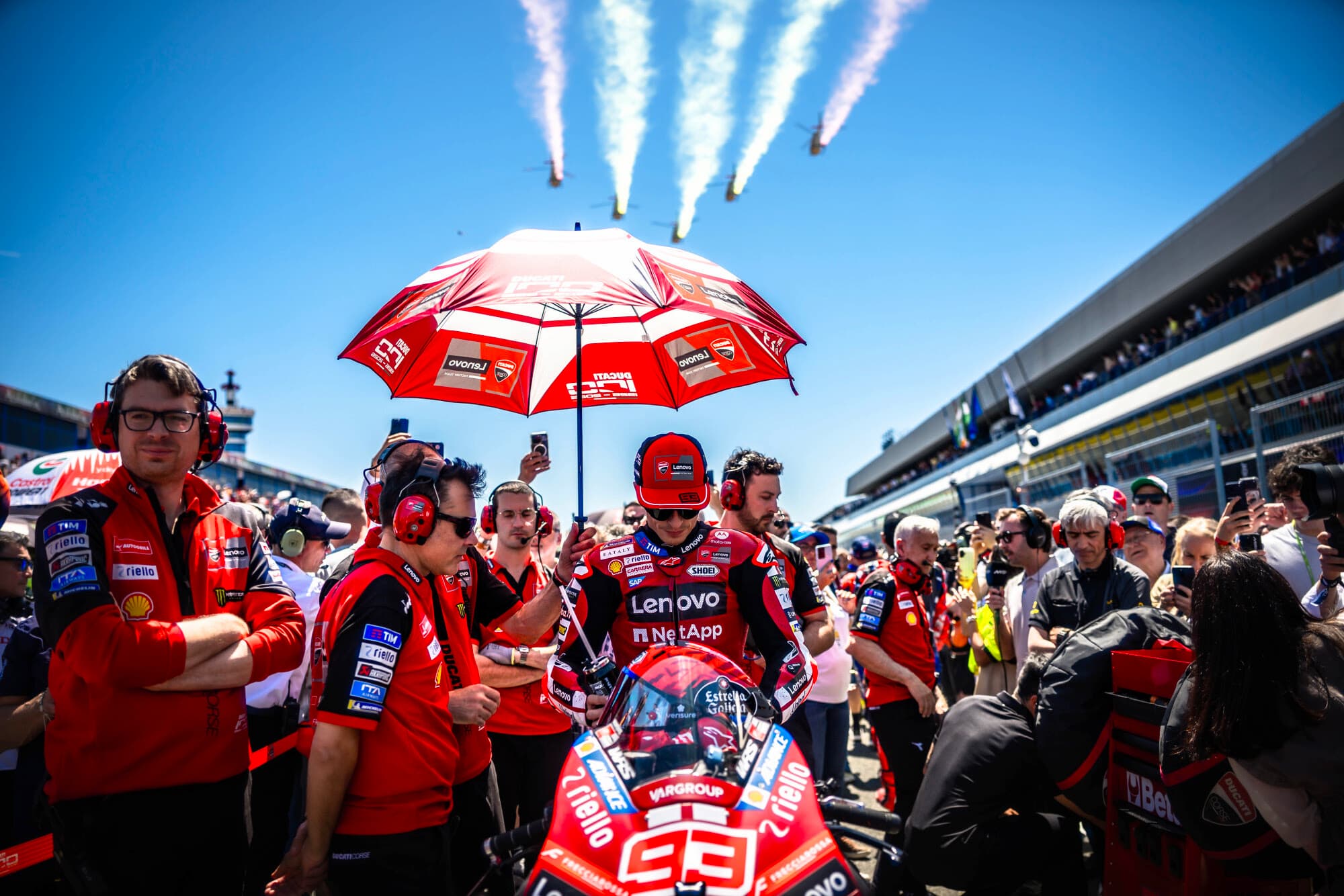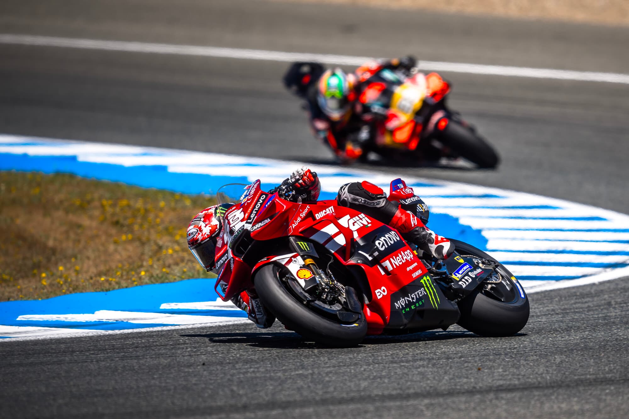在週六衝刺賽包辦一、二名之後,Ducati Lenovo 廠隊卻以完全沒想到的結果,在Jerez賽道結束這場西班牙站。Marc Márquez 正賽跑到第二圈、當時排在第二時摔車出局;Francesco Bagnaia 則是在第十三圈因狀況退賽。